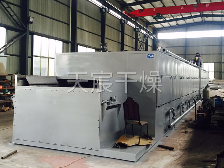 物料由加料器均勻(yún)地鋪在網帶(dài)上,網帶一般采用12-60目(mù)不鏽鋼絲網,由傳動(dòng)裝置拖動在(zài)幹燥機內移動。幹燥(zào)機由若(ruò)幹單元組成,每一單(dān)元熱風獨立循環,部分尾氣由專門排濕(shī)風機排出(chū),廢氣(qì)由調節閥控製,熱氣(qì)由下往上或由上往下穿過鋪滿物料的(de)網(wǎng)帶完成熱量與質量傳遞的進(jìn)程,帶走物料水份。網帶緩慢移動,運行速度可根據物料溫度自由調節,幹燥後的成(chéng)品(pǐn)連續落入收料器中。上下循環單元根據用戶需要可靈活配備,單元數量亦(yì)可根據(jù)需要選取。