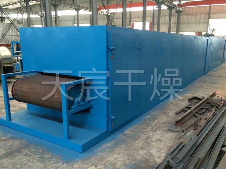 物料由加料器均勻地鋪在網帶上,網帶(dài)一般采用12-60目不(bú)鏽鋼絲網(wǎng),由(yóu)傳動裝置拖動(dòng)在幹燥機內移動。幹燥機由若幹單元組成,每一單元熱(rè)風獨立循環,部分尾氣由專(zhuān)門排濕風機排出,廢氣由調節閥控製(zhì),熱氣(qì)由(yóu)下(xià)往上或由上往下穿過鋪滿物料的網帶完成熱量與質量傳遞的進程,帶走物料水份。網帶緩慢移動,運行速度可根據物料溫度自由調節(jiē),幹(gàn)燥後的成品連續落入收料(liào)器中。上下循環單元根據用戶需要可靈活配備,單元數(shù)量亦可根據需要選取。