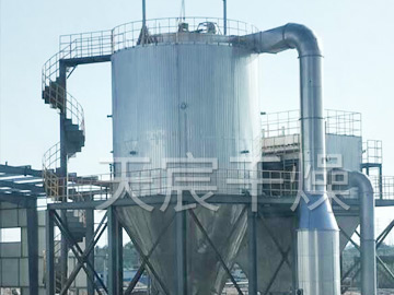 空氣經過濾和加熱,進入幹燥器頂部空氣分配器,熱空氣呈螺旋狀均勻地進入幹燥室。料液經塔體頂部的高速離心(xīn)霧化器,(旋(xuán)轉)噴霧成極細微的霧狀液珠,與熱空氣並(bìng)流(liú)接觸在極短(duǎn)的時間內可幹燥(zào)為成品。成(chéng)品連續地由幹(gàn)燥塔(tǎ)底部和旋風分離器中輸出,廢(fèi)氣由風(fēng)機(jī)排空。